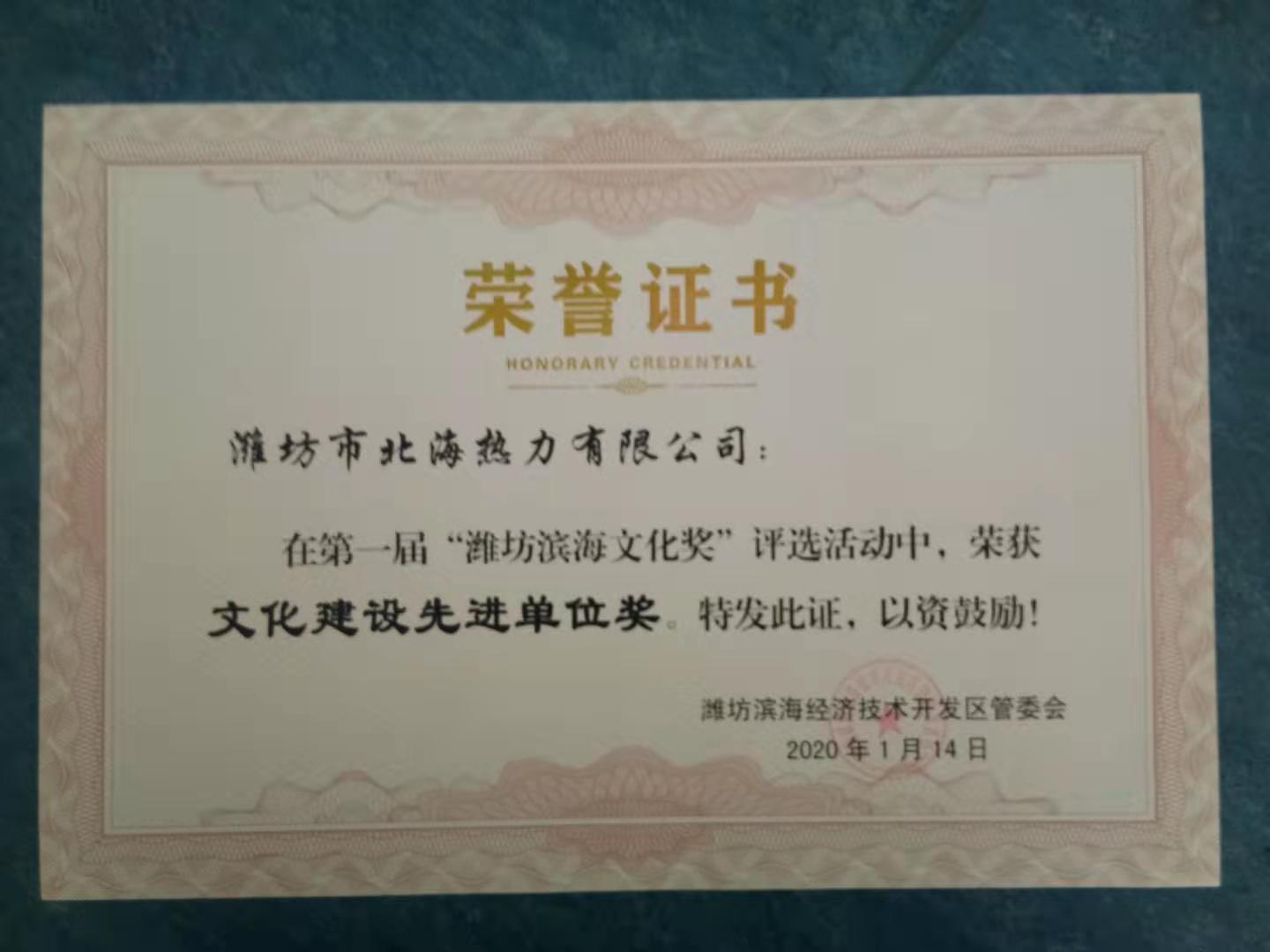 1月14日,北海熱力在第一屆濰坊濱海文化獎(jiǎng)評(píng)選活動(dòng)中,榮獲文化建設(shè)先進(jìn)單位獎(jiǎng)。濰坊濱海文化獎(jiǎng)是由管委會(huì)批準(zhǔn)設(shè)立的全區(qū)文化建設(shè)最高獎(jiǎng)項(xiàng)。此次獲獎(jiǎng),是對(duì)公司文化建設(shè)和發(fā)展成果的肯定,公司必將以更加飽滿的熱情投入到全區(qū)文化建設(shè)中去,全力推進(jìn)文化事業(yè)繁榮發(fā)展、為推動(dòng)濱海高質(zhì)量發(fā)展作出自己應(yīng)盡的貢獻(xiàn)。